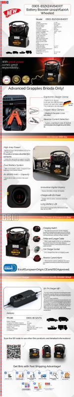 It is the heavy-duty start booster trolley with 2 x 33 Ah - 6400/3200 peak amps. It provides additional power to the batteries. Has digital voltmeter, 12 V - 7 Ah premium smart charger, 50 mm2 pure copper cables and large industrial pure brass clamps built-in trolley. It also has safety features such as reverse polarity alarm, 12/24 V switch and new clamp with built-in safety fuse.