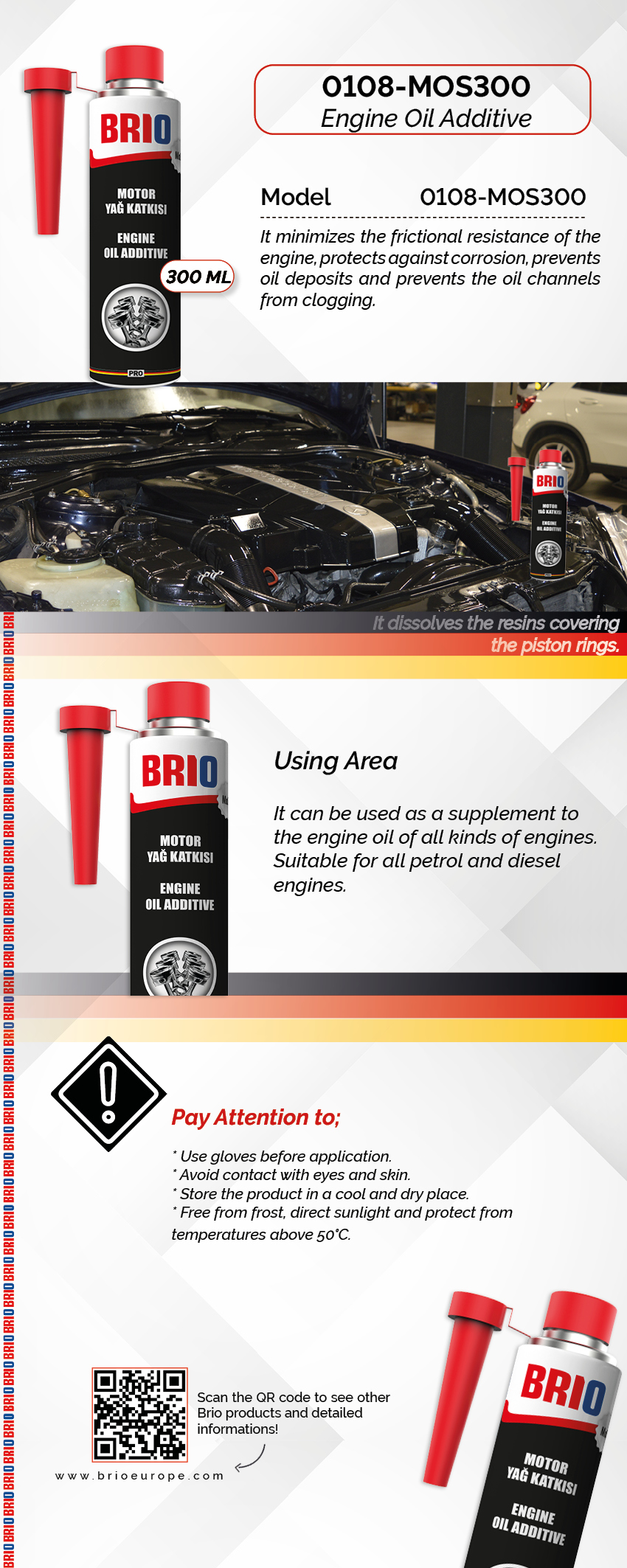 Minimizes the friction resistance, protects against corrosion, prevents oil sedimentation and clogging of oil ducts. It also neutralizes the aggressive combustion acids and regenerates the used engine oil substances. Solves resin covered the piston rings. It can be added to the engine every time during the engine oil change, engine oil check or engine repair.