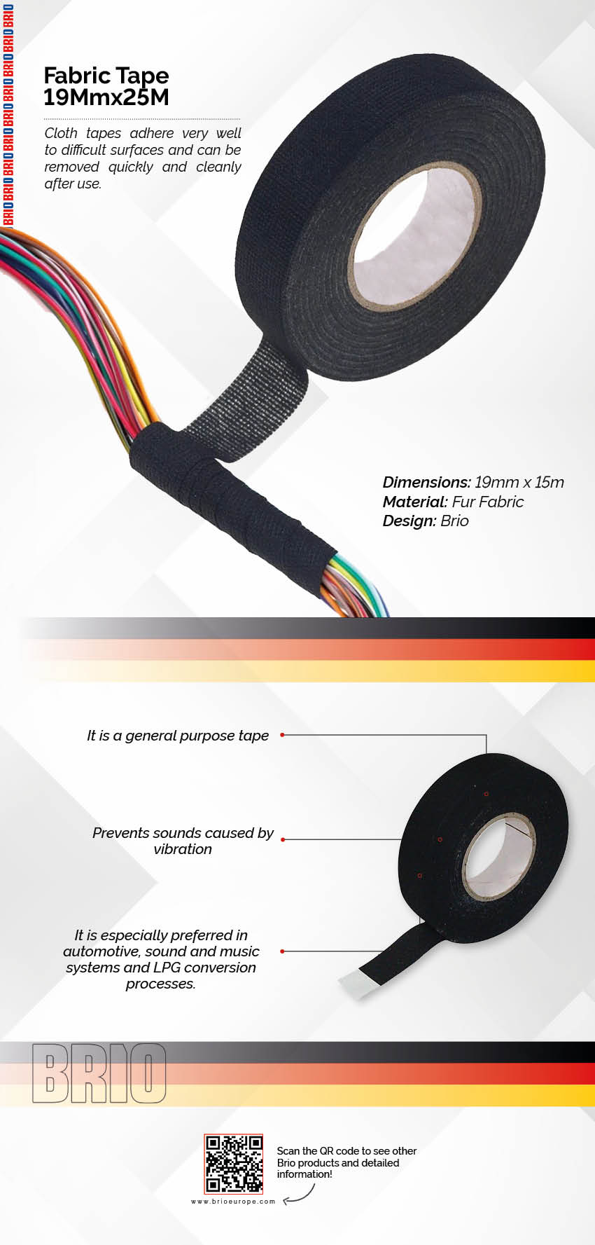It is a multi-purpose fabric tape. Resistant to high temperatures. Can be pulled off. Has a long life. Also has an excellent adhesion and sound insulation capability. Can be used for gathering cable harnesses. It has the following features: Dimensions: 19mmx15m. Material: Fur Fabric Design: Brio