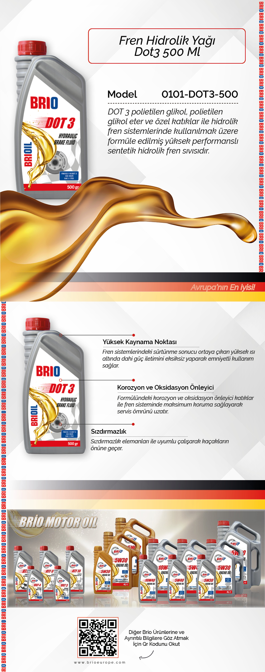 DOT 3 polietilen glikol, polietilen glikol eter ve özel katıklar ile hidrolik fren sistemlerinde kullanılmak üzere formüle edilmiş yüksek performanslı sentetik hidrolik fren sıvısıdır. Yüksek kaynama noktası özelliği