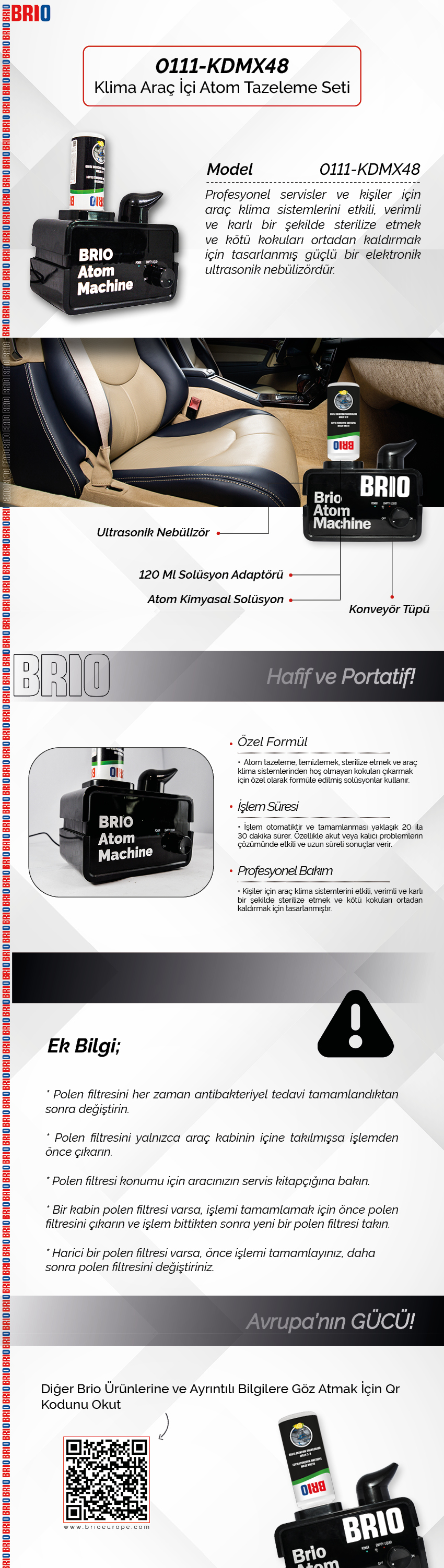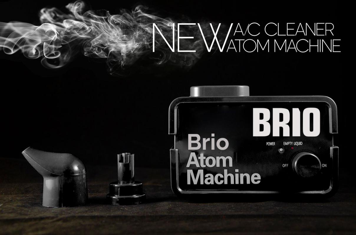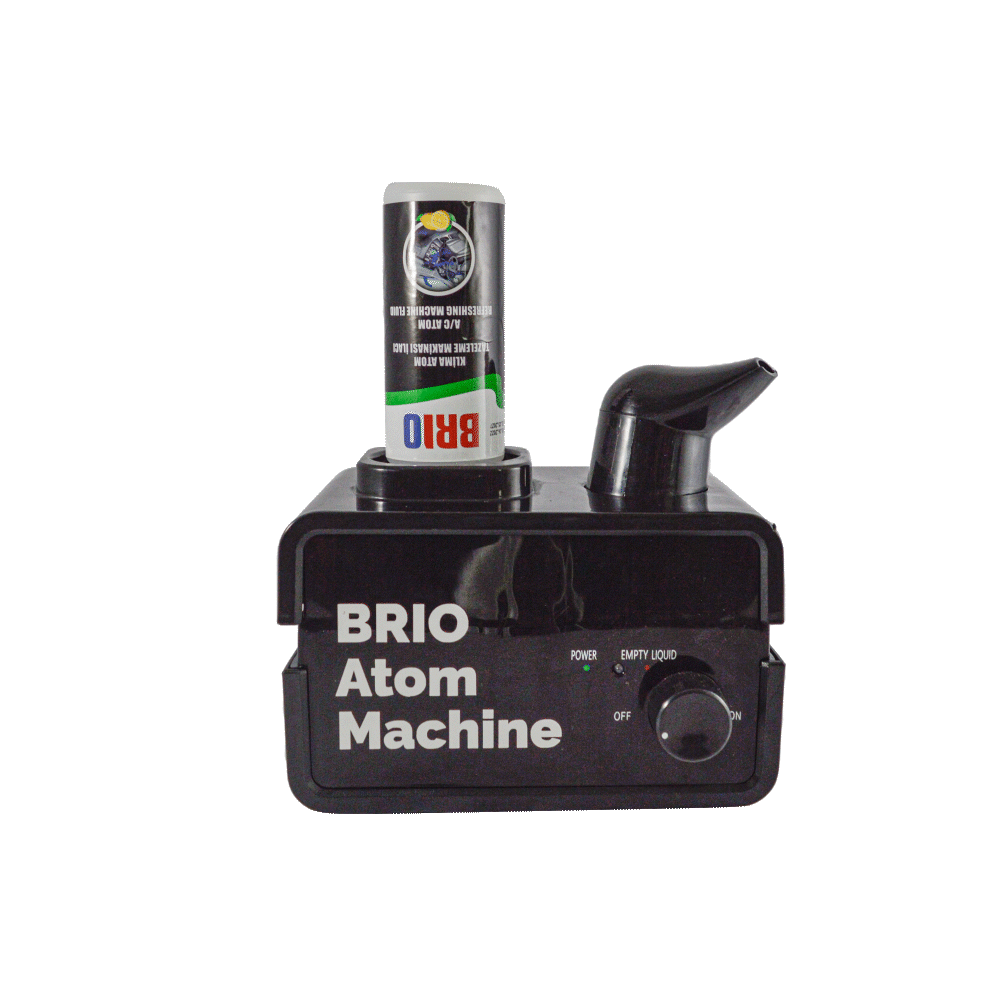 Brio Atom Klima Tazeleme makinesini yolcu paspasının üstüne yerleştirin ve konveyör borusunu devridaim hava girişine mümkün olduğunca yakın yerleştirin. Aracın motorunu çalıştırın. Klima sistem sıcaklığını 22 santigrat dereceye ayarlayın Tüm havalandırma deliklerini açın. Ön Havalandırmayı seçin. Fanı orta hıza ayarlayın ve hava devridaim(sirkülasyon) modunu seçin. Atom makinesini açın ve diyotu maksimuma çıkarın. Elektrik kablosunu kapıdan geçirin. Tüm kapı ve pencereleri kapatın ve araçtan çıkın. Temizleme işlemi süresince herhangi bir kişiyi veya evcil hayvanı araçta bırakmayın. Atom makinası ile temizlik uygulaması 20 veya 22 santigrat derecede ortalama 30 dakika sürer . Bu, ortam sıcaklığına göre değişebilir. Atom makinesi, minimum sıvı seviyesine ulaşıldığında otomatik olarak durur ve kırmızı LED ışığı görüntülenir. Tedaviden sonra aracı beş ila on dakika havalandırın. Her kullanımdan sonra polen filtresini değiştirin. Kullanımdan sonra makinenin içinde bir miktarda solüsyon kalabilir, bu sıvıyı boşaltmaya gerek yoktur. Atom makinesinini bir sonraki temizlik ve tazeleme işlemi için hazır dik bir konumda güvenle saklayın.