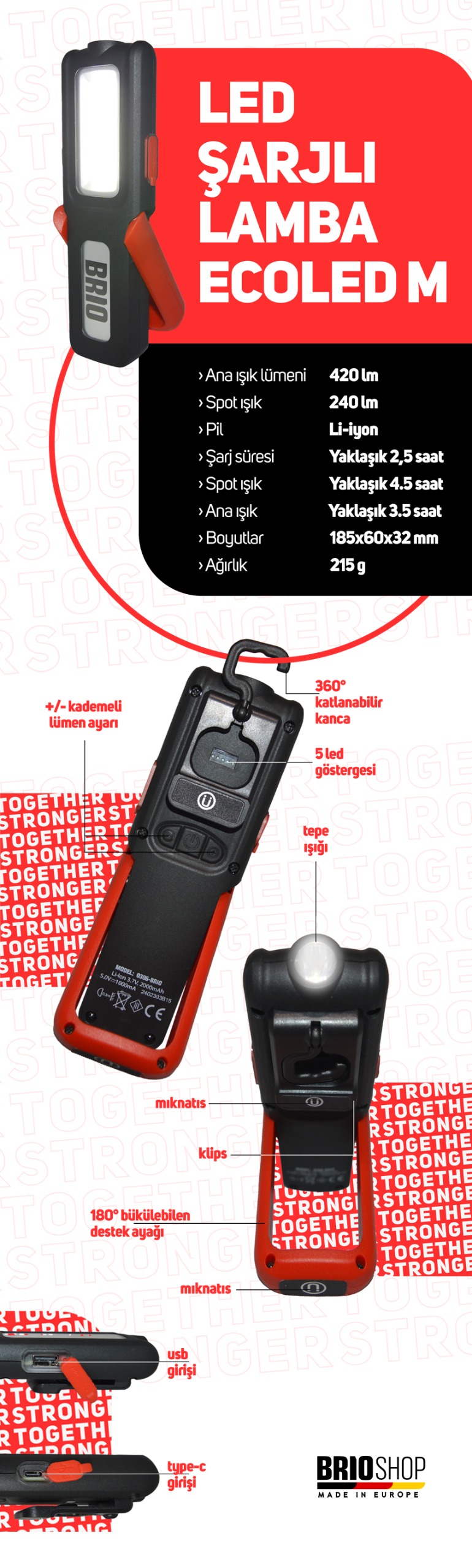 olarak 2,5-3 saat boyunca sürekli olarak ışık verebilir. Entegre 1200mAh Li-Ion pil, birlikte