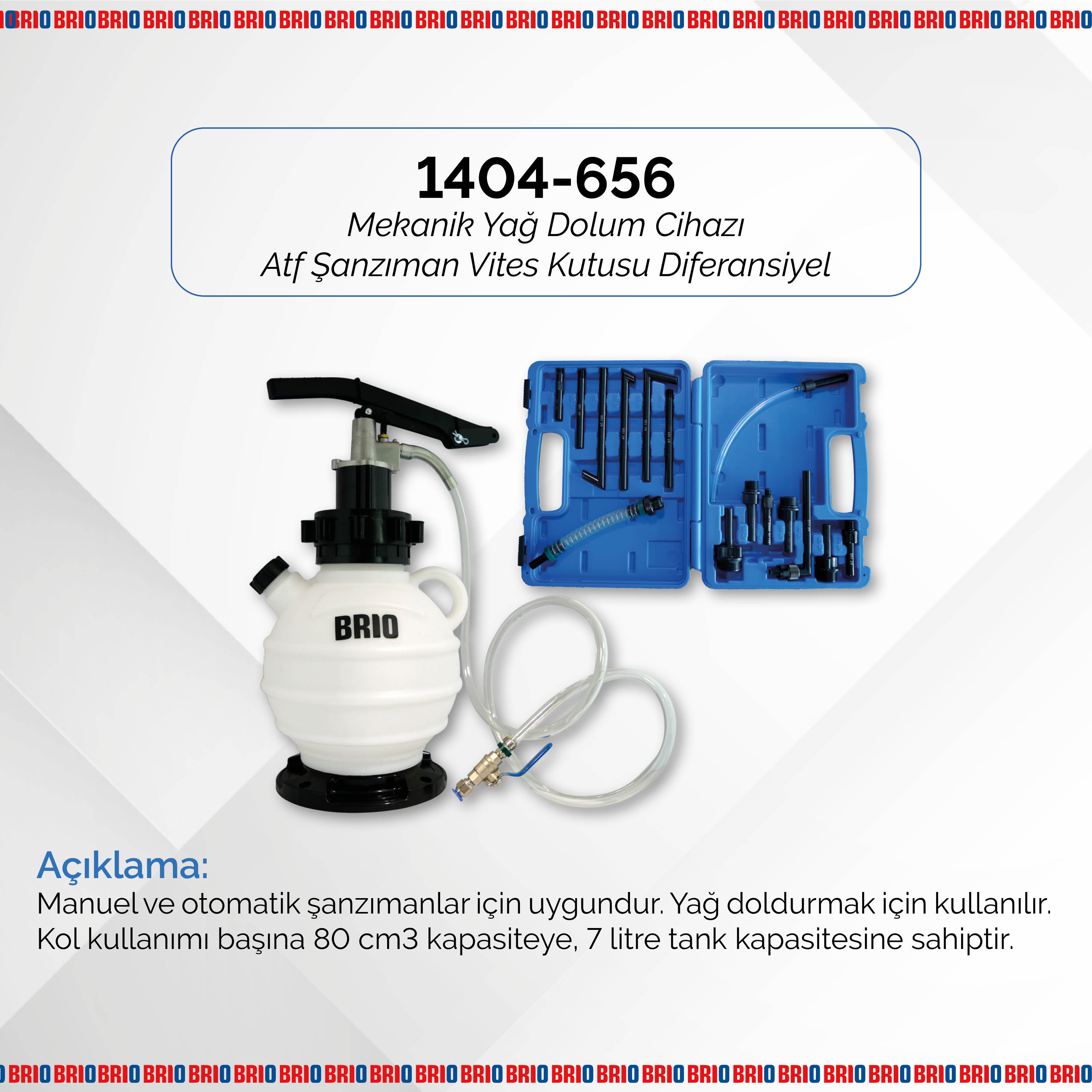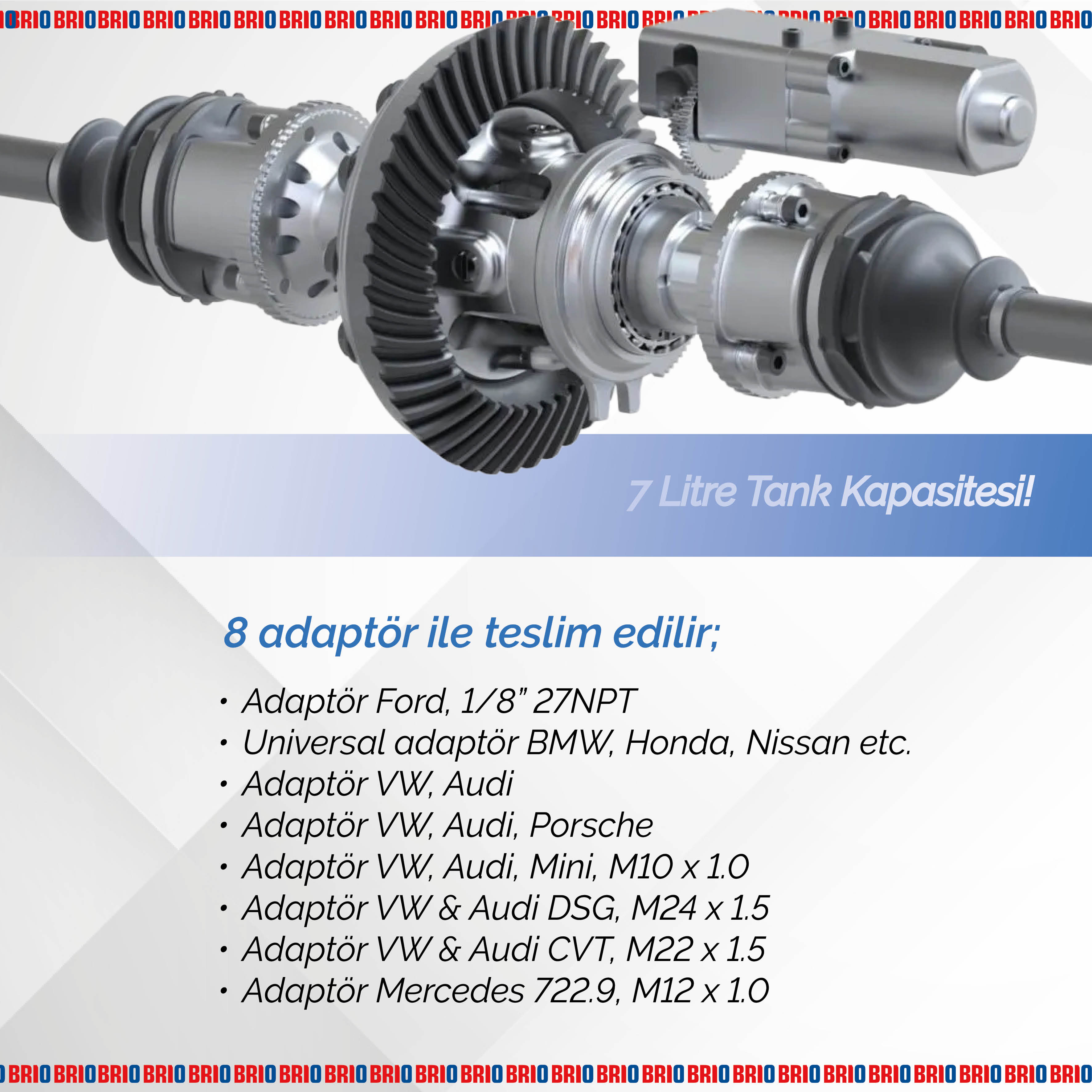 Manuel ve otomatik şanzımanlar için uygundur. Yağ doldurmak için kullanılır. Kol kullanımı başına 80 cm3 kapasiteye, 7 litre tank kapasitesine sahiptir. SAE 0 – SAE 140 viskozite aralığı için uygundur. Aşağıda sıralanmış olan 8 adaptör ile teslim
