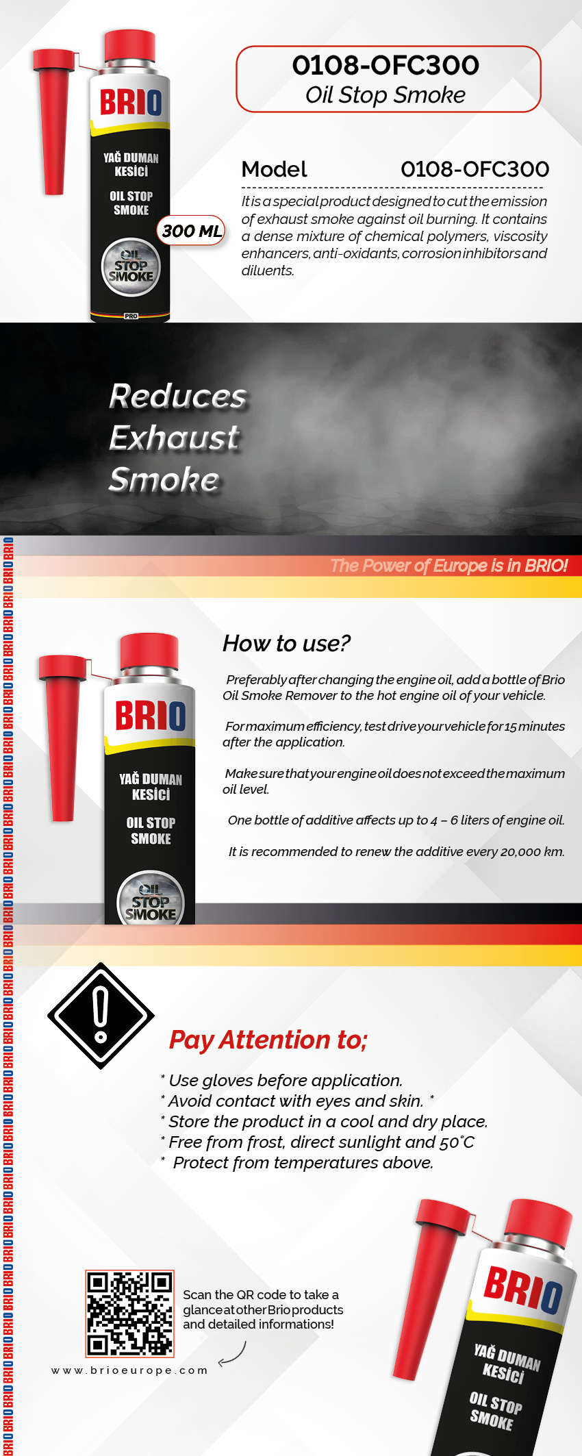 Add a bottle of Brio Anti-Smoke Additive to the warm engine oil of the vehicle preferably after changing its engine oil. After the application, test drive the vehicle for 15 minutes for maximum efficiency. Make sure vehicles engine oil does not exceed the maximum oil level. One bottle of additive mixes up to 4 - 6 litres of engine oil. It is recommended to replace oil additive once in every 20,000 km.