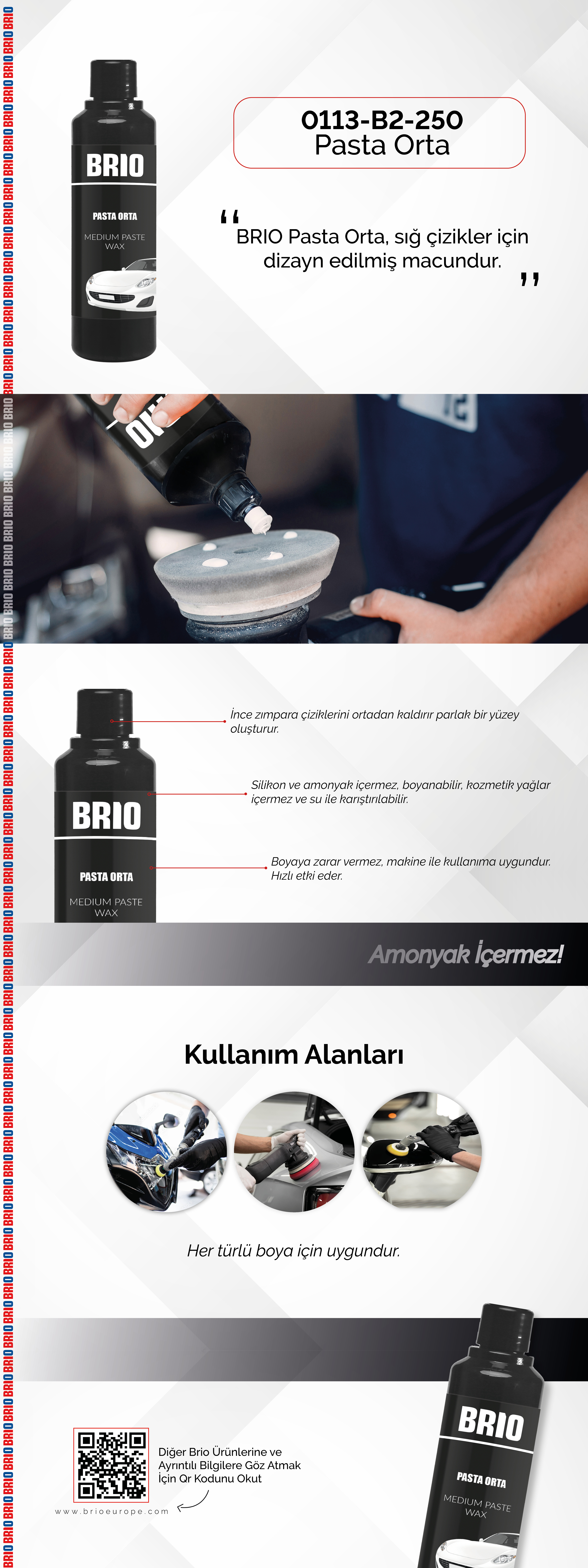 orta çizikler için dizayn edilmiş macundur. Her renk için uygundur. Silikon ve amonyak içermez, boyanabilir, kozmetik yağlar içermez ve su ile karıştırılabilir. Boyaya zarar vermez, makine ile kullanıma uygundur. Hızlı etki eder.