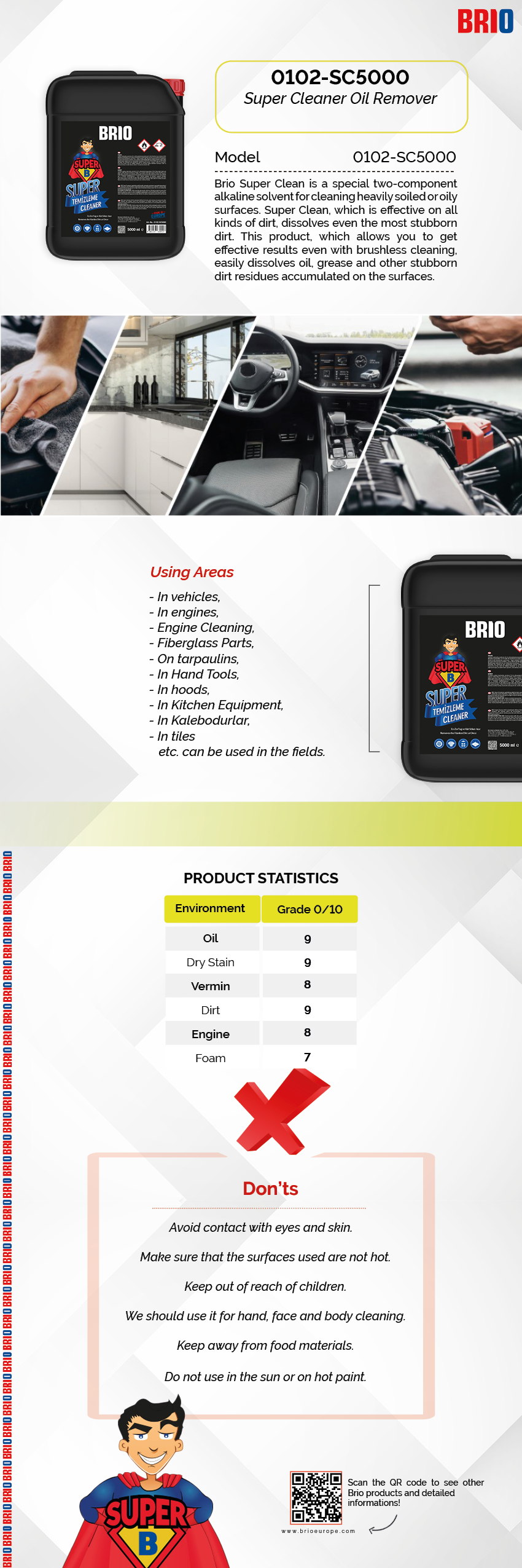 Brio Süper Temizleme çok kirli veya yağlı yüzeyleri temizlemek için özel iki bileşenli alkalin çözücüdür. Ürün kimyasal formülü sayesinde temizliğin ve doğanın rengi olan yeşil renktedir. Ürün yumuşak deterjan karakteristik kokusuna sahiptir. Her türlü kir üzerinde etkili olan Brio Süper Temizleme en inatçı kirleri bile derinlemesine çözer. Fırçasız temizlikte bile etkili sonuçlar almanızı sağlayan bu ürün yüzeylerde birikmiş olan yağ, gres ve diğer inatçı kir kalıntılarını kolayca çözer.