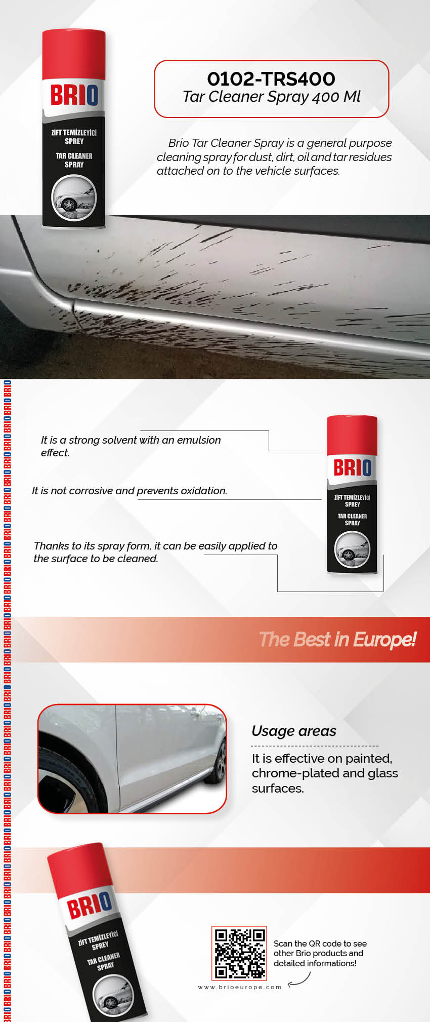 Brio Tar Cleaner Spray is a general purpose cleaning spray for dust, dirt, oil and tar residues attached on to the vehicle surfaces. The mixture is non-corrosive for the exterior parts of the vehicle, and it prevents rust and oxidation. It is easy to use.