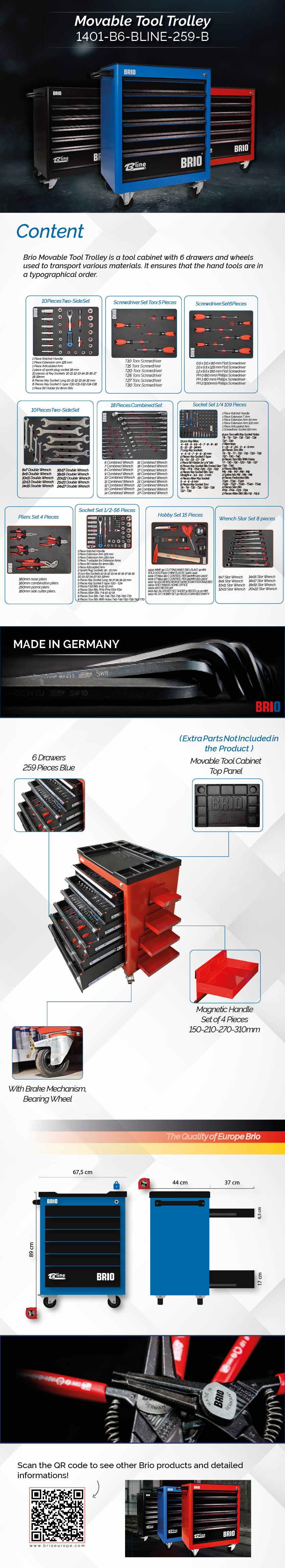 259 PIECES GERMAN QUALITY 6 DRAWERS B-Line BLUE TOOL TROLLEY Content: