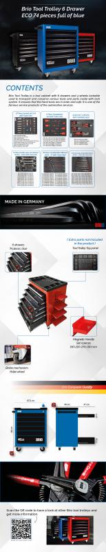 The workshop trolley with 6 drawers and roller wheels to carry various tools. It contains the following products;