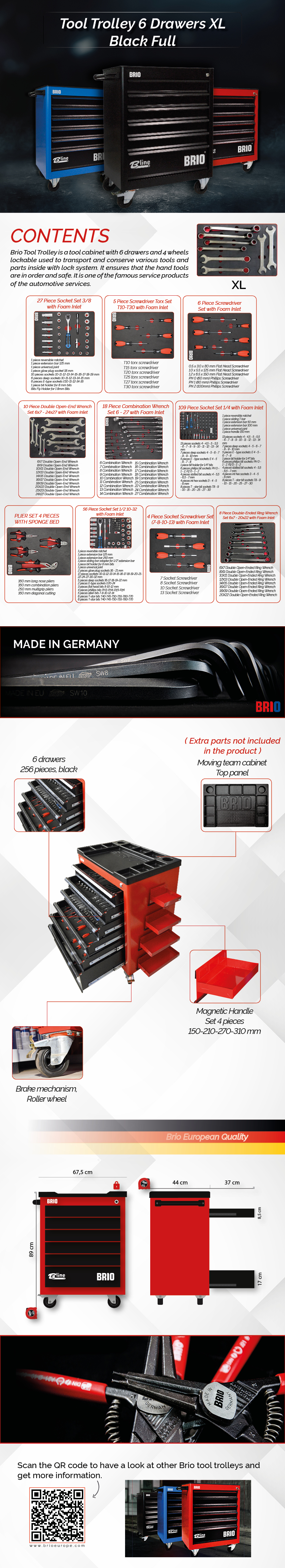 The workshop trolley with 6 drawers and roller wheels to carry various tools. It contains the following products;