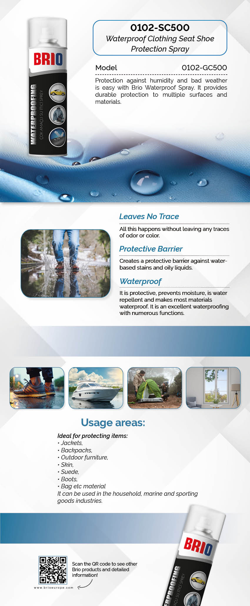 Protection against humidity and bad weather is easy with Brio Waterproof Spray. It provides durable protection to multiple surfaces and materials. This product does not leave trace of odor or color after use. It also creates a protective barrier against water-based stains and oily liquids. It is protective, prevents moisture, makes most materials water repellent and water proof when used. It is an excellent waterproofing product with numerous functions. Uses: Ideal for protecting items: jackets, backpacks, outdoor furniture, leather, suede, boots, bags, etc. It can be used in the household items, marine and sporting goods industries. Directions for Use: Use the product in a ventilated place. Shake before use. Clean the application surface (the surface must be clean and dry) Apply the product from a distance of approximately 20 cm. For best results, we recommend repeating the application after a few hours.