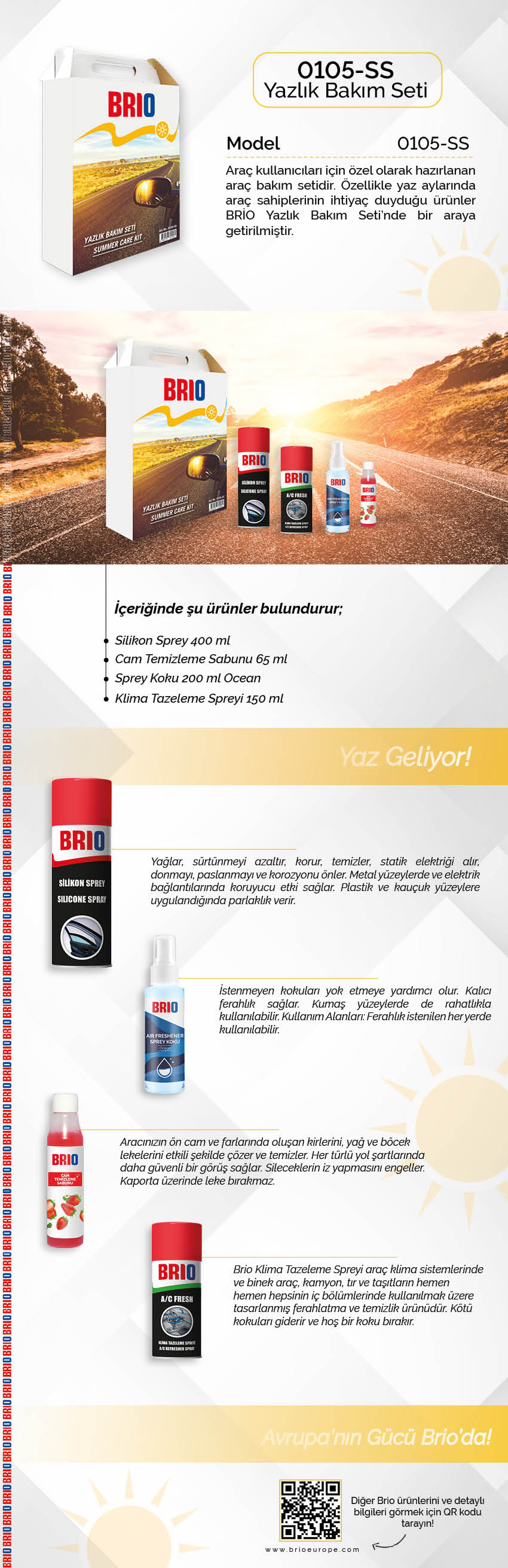 Araç kullanıcıları için özel olarak hazırlanan araç bakım setidir. Özellikle yaz aylarında araç sahiplerinin ihtiyaç duyduğu ürünler BRİO Yazlık Bakım Seti’nde bir araya getirilmiştir. İçeriğinde şu ürünleri bulundurur;